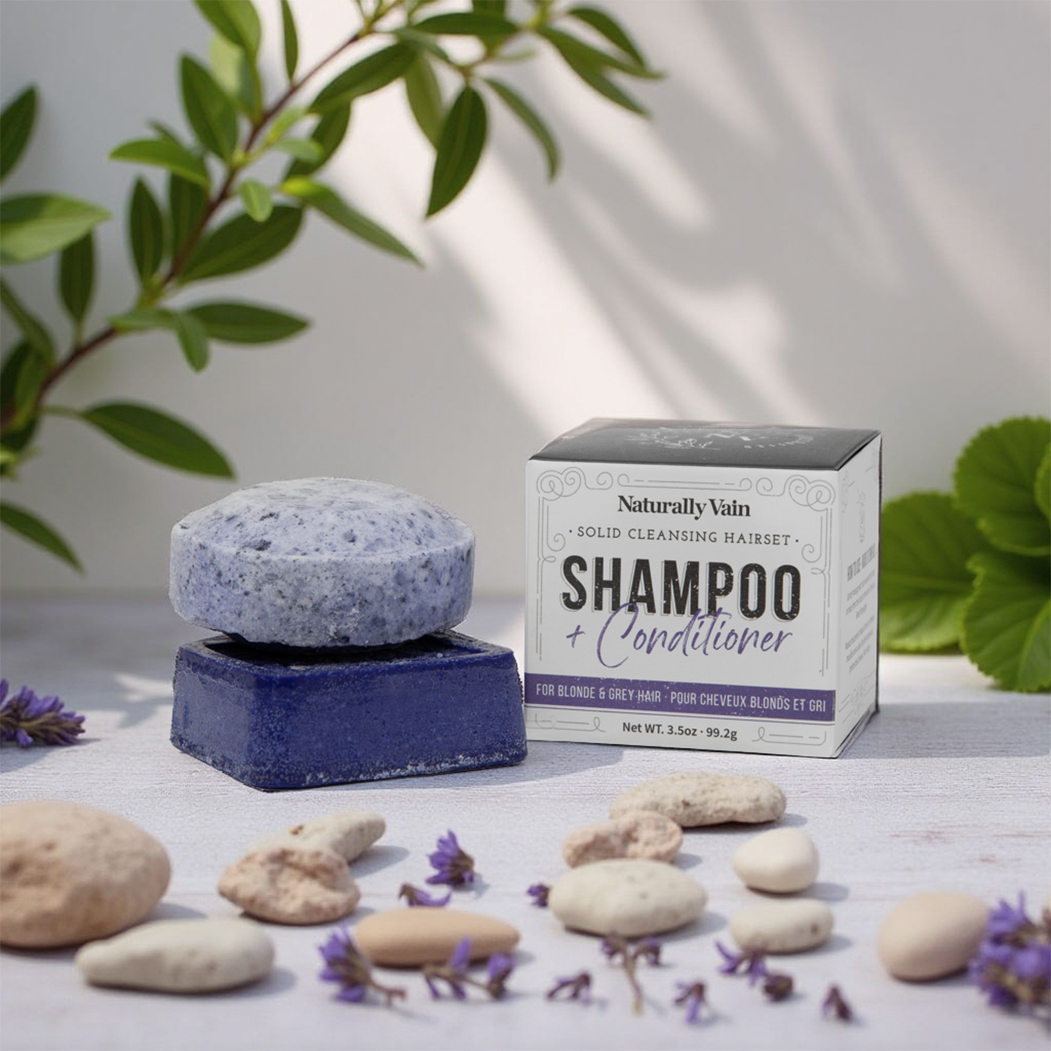Ideal for blonde or grey hair. This set includes the Purple Reign shampoo & conditioner bar, specifically formulated to tone down yellow and orange hues in blonde and grey hair, ensuring a purer, brighter color.This solid eco-friendly option comes with 1 conditioner bar and 1 shampoo bar. Each of these bars is handmade with natural ingredients and will last 40-60 washes per use.