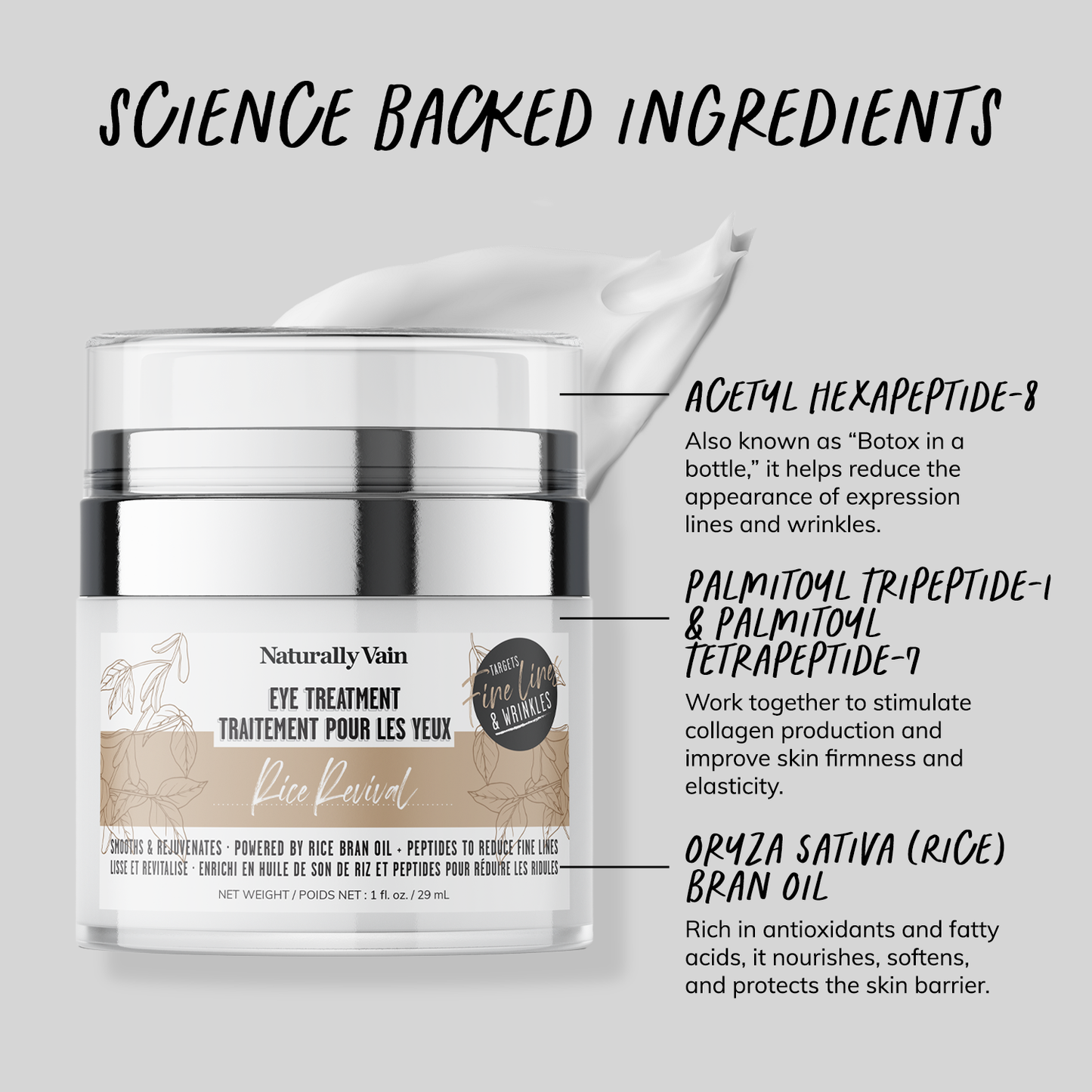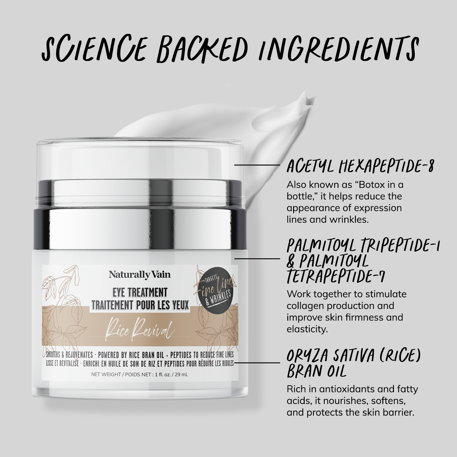 • Aqua, Oryza Sativa (Rice) Bran Oil, Propanediol, Isopropyl Myristate, Emulsifying Wax NF, Squalane, C12-15 Alkyl Benzoate, Glycine Soja (Soybean) Oil, Aloe Barbadensis Leaf Extract, Butylene Glycol, Carbomer, Polysorbate 20, Acetyl Hexapeptide-8, Palmitoyl Tripeptide-1, Palmitoyl Tetrapeptide-7, Propylene Glycol, Diazolidinyl Urea, Iodopropynyl Butylcarbamate.