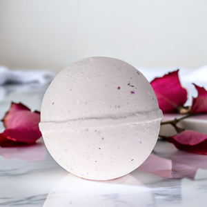 This bath bomb is made with rose and geranium essential oil and topped with fresh crushed rose petals.